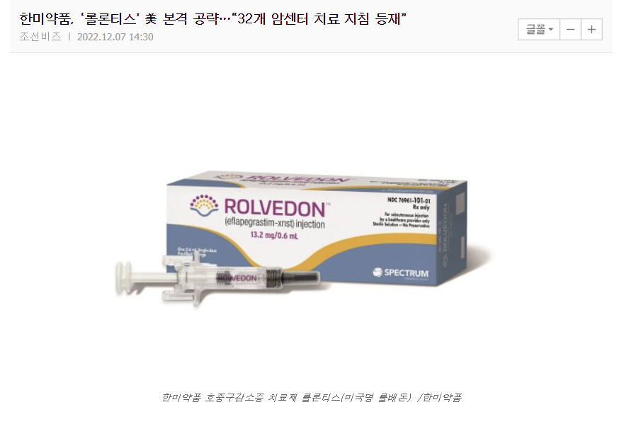 무슨 일이 있었는지 확인해보니 7일에 항암 치료제로 FDA 허가를 받은 롤론티스(미국명 롤베돈)가 미국국가종합암네트워크 치료 옵션 가이드라인에 포함되었다는 기사가 나온 것을 확인하였습니다.