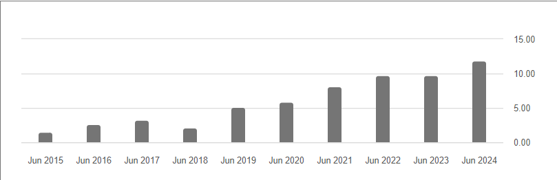 - 주당 순이익(EPS) 및 배당금: EPS는 2015년 $1.49에서 2024년 $11.86로 크게 증가, 배당금도 지속적으로 상승해 왔습니다.