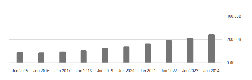 - 연간 매출 및 성장률: 2015년 $93.6 billion에서 2024년 $245.1 billion으로 증가, 연평균 성장률(CAGR)은 약 11.2%입니다.