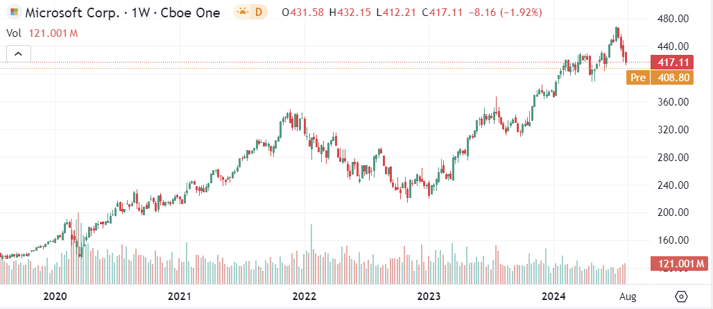 마이크로소프트의 주가는 최근 몇 년간 꾸준한 상승세를 보였습니다. 2023년 말 기준 주가는 약 $280에서 $340 사이를 오갔으며, 2024년 초에는 $350을 돌파하는 등 강력한 상승 모멘텀을 이어가고 있습니다. 이는 회사의 견고한 재무 실적과 클라우드 사업의 성장에 기인한 것입니다.
