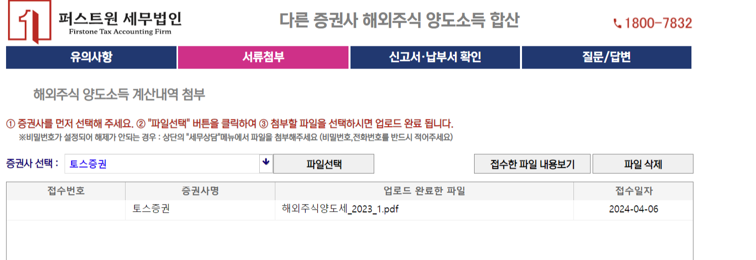 7. 서류첨부 탭에 들어가서 토스증권 선택 후 파일선택을 눌러 처음에 토스증권에서 받았던 양도소득세 증명서를 첨부해줍니다.