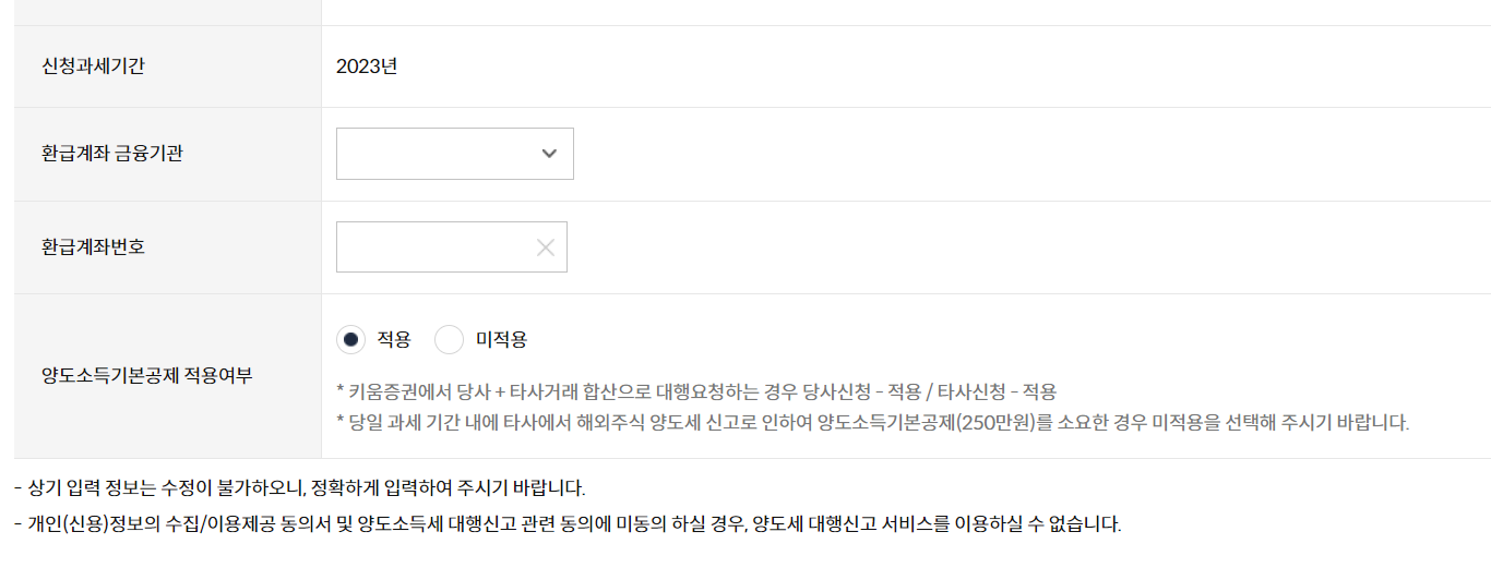 5. 환급금이 생길 경우에 환급받을 계좌번호와 기본공제 250만원 적용 여부를 선택합니다. 키움에서만 신청하시는 거면 적용을 누르시면 되고, 혹시나 다른 증권사에서 이미 기본공제로 신청을 하셨다면 미적용을 누르시면 됩니다.
