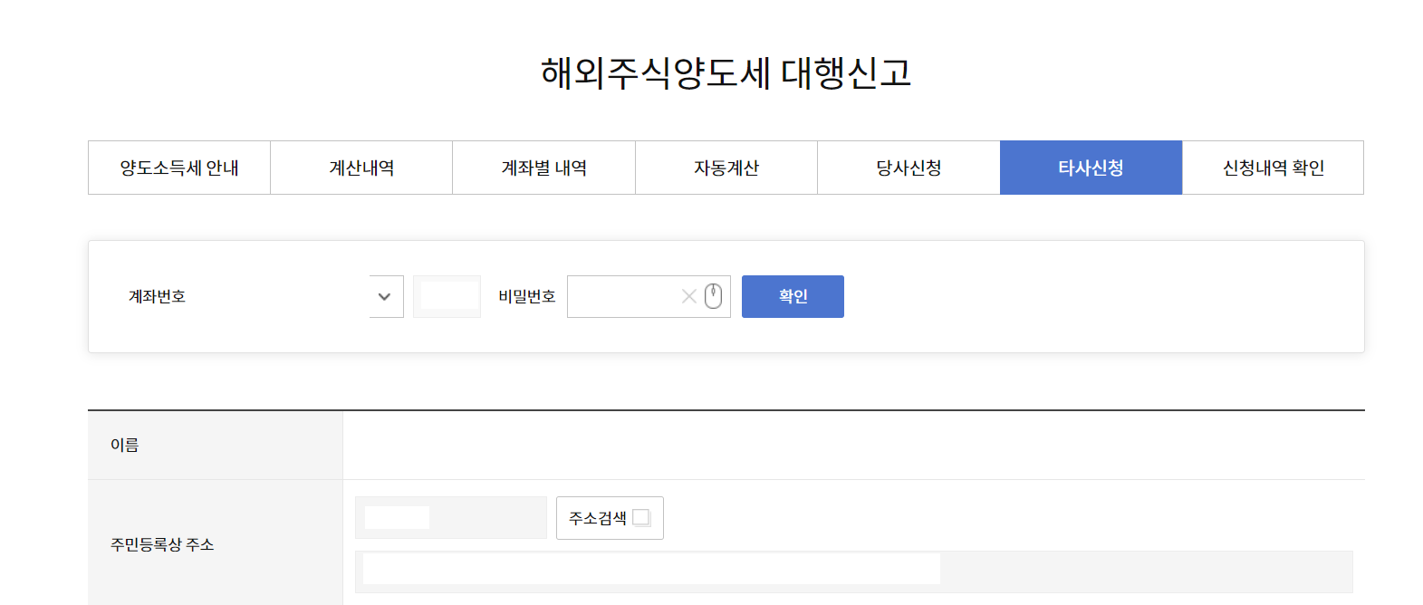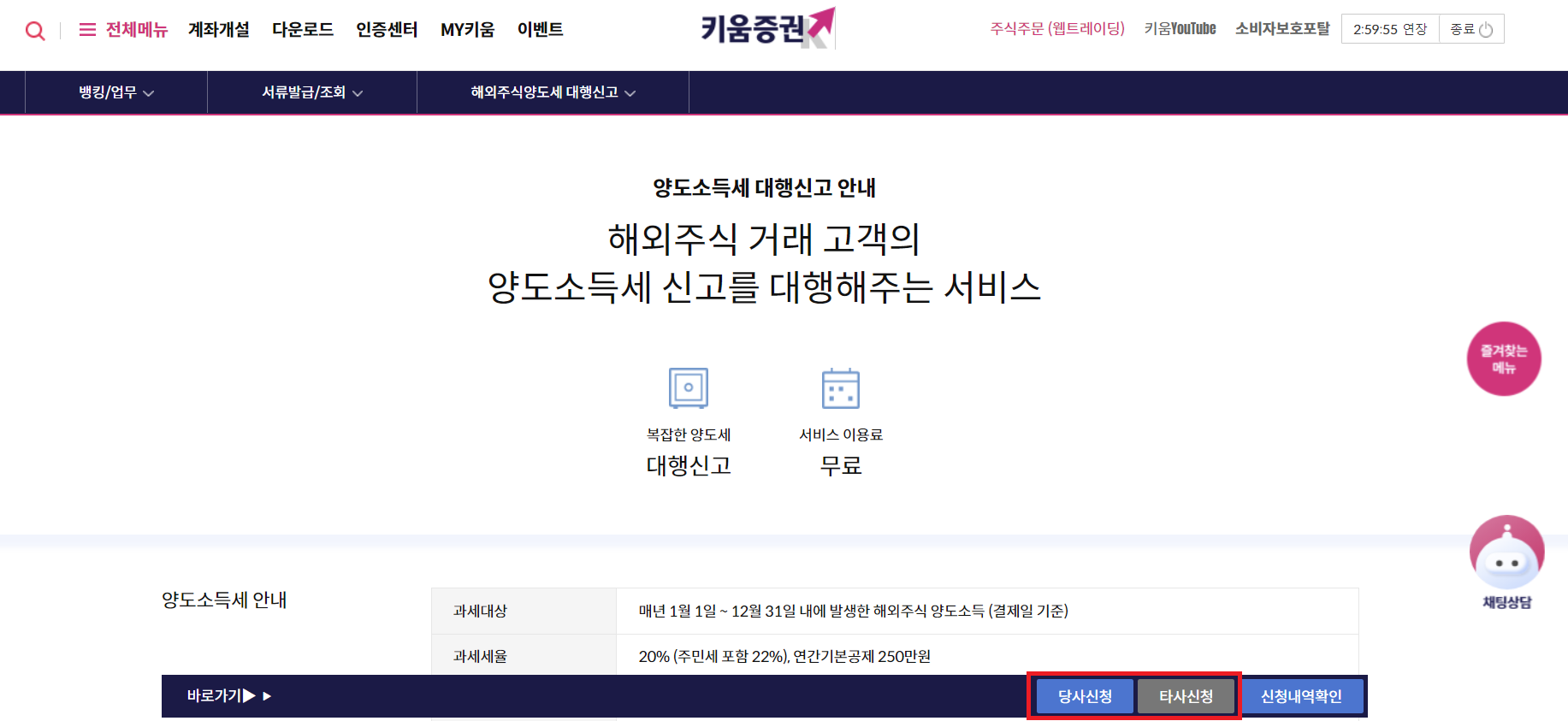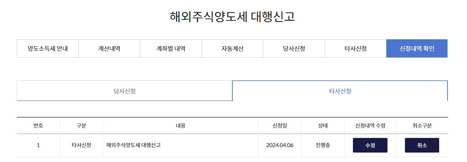 양도소득세 대행 신고는 키움에서 발생한 소득(당사 신청)과 타 증권사에서 발생한 소득(타사 신청)으로 나뉩니다.