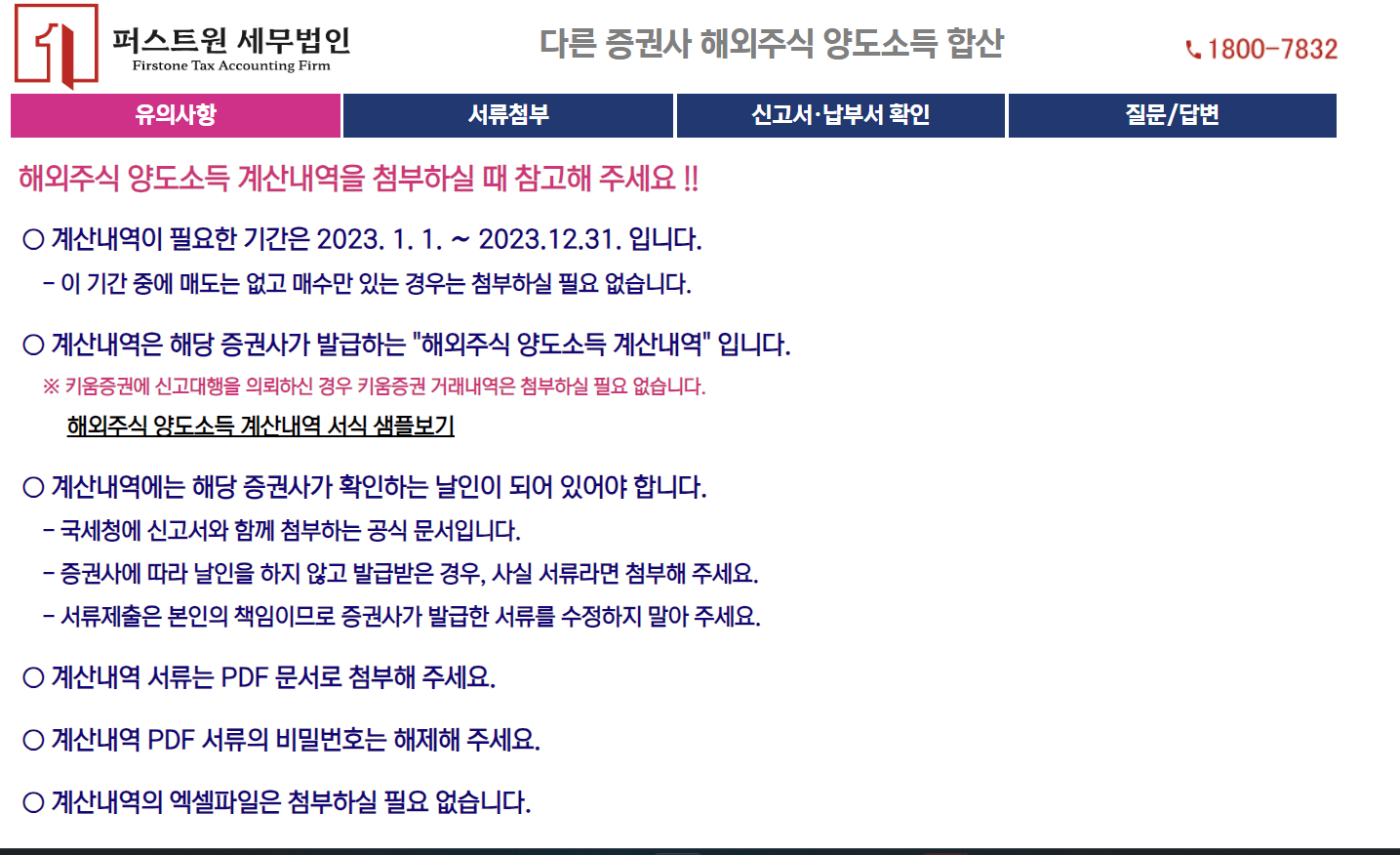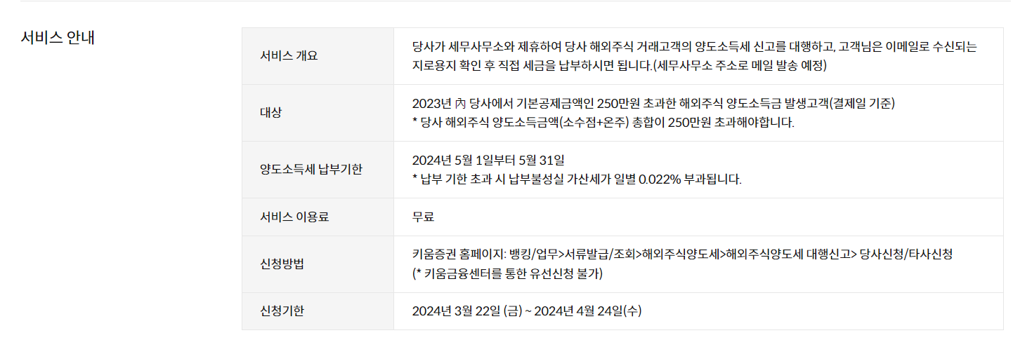 키움증권에서 양도소득세 대행 신고를 하기 위해서는 2023년에 키움증권에서 거래한 해외주식 수익이 250만원이 넘으셔야 합니다.