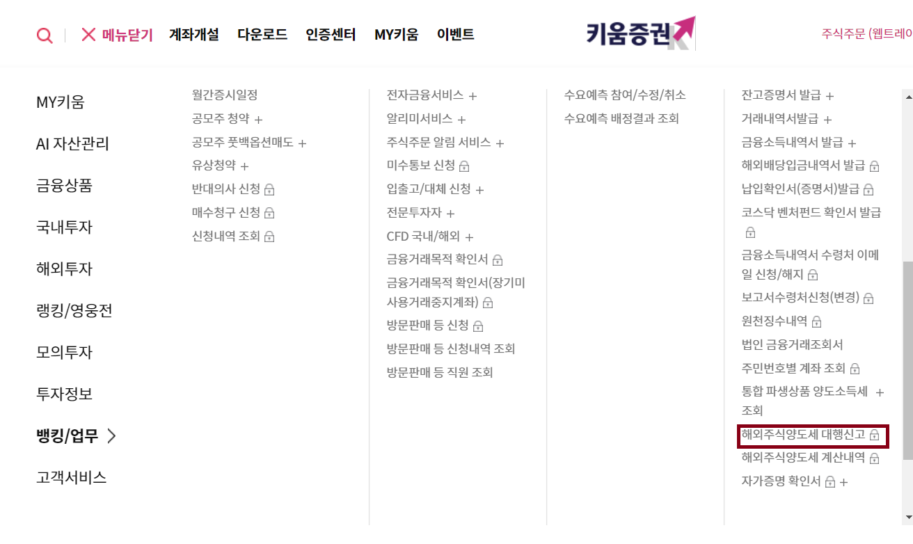 2. 전체메뉴 - 뱅킹/업무 - 서류발급/조회 - 해외주식양도세 대행신고 메뉴를 선택합니다.