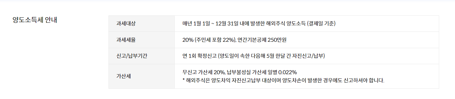 국내주식은 시장부양책 중 하나로 아직까지 양도소득세를 부과하고 있진 않지만 해외주식은 양도소득세 대상입니다.