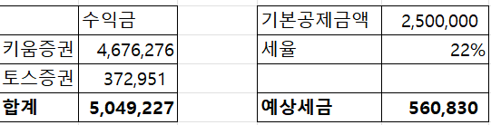 전 키움증권에서 4,676,276원, 토스증권에서 372, 951원의 수익을 내어 2023년에 총 5,049,227원의 양도소득이 생겼습니다. 여기서 기본공제금액인 250만원을 빼고 남은 금액인 2,549,227원의 22%인 560,830원이 양도소득세로 나올 것 같습니다. 이렇게 대략적으로라도 나올 금액을 생각하고 있다가 나중에 고지서가 나오면 금액이 맞는지 꼭 확인해봐야 합니다.