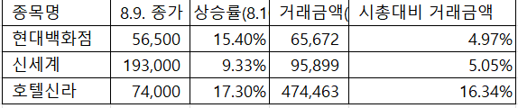 상승률이 높은 순으로는 호텔신라, 현대백화점, 신세계 순이었고, 시총대비 거래금액이 많이 들어온 순은 호텔신라, 신세계, 현대백화점 순이었습니다.