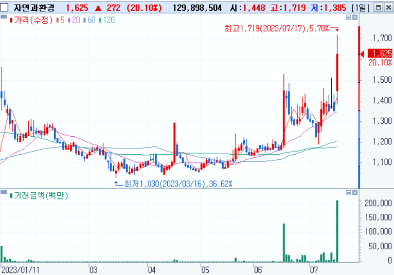 자연과환경은 환경생태복원사업, 토양정화사업, PC저류조사업, 기타 건축공사업 등을 영위하는 기업으로 주요 매출처가 국가기관인 국토관리청, 서울시청 등 지방자치단체와 주택, 토지, 도로공사 등 공공기관입니다. 피해지역을 재건해야하기 때문에 홍수 관련주로 꼽힙니다.