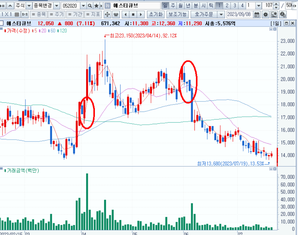 ASCO에 참여한다는 기사가 난 후 거래대금이 몰렸지만 윗꼬리를 길게 단 양봉으로 마무리하였습니다. 그 이후 행사개최일까지 가격을 회복하지 못하였습니다.
