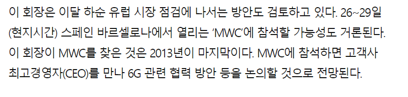 이재용 회장이 MWC에 참가하여 6G에 대해 논의할 것으로 알려져 있습니다.