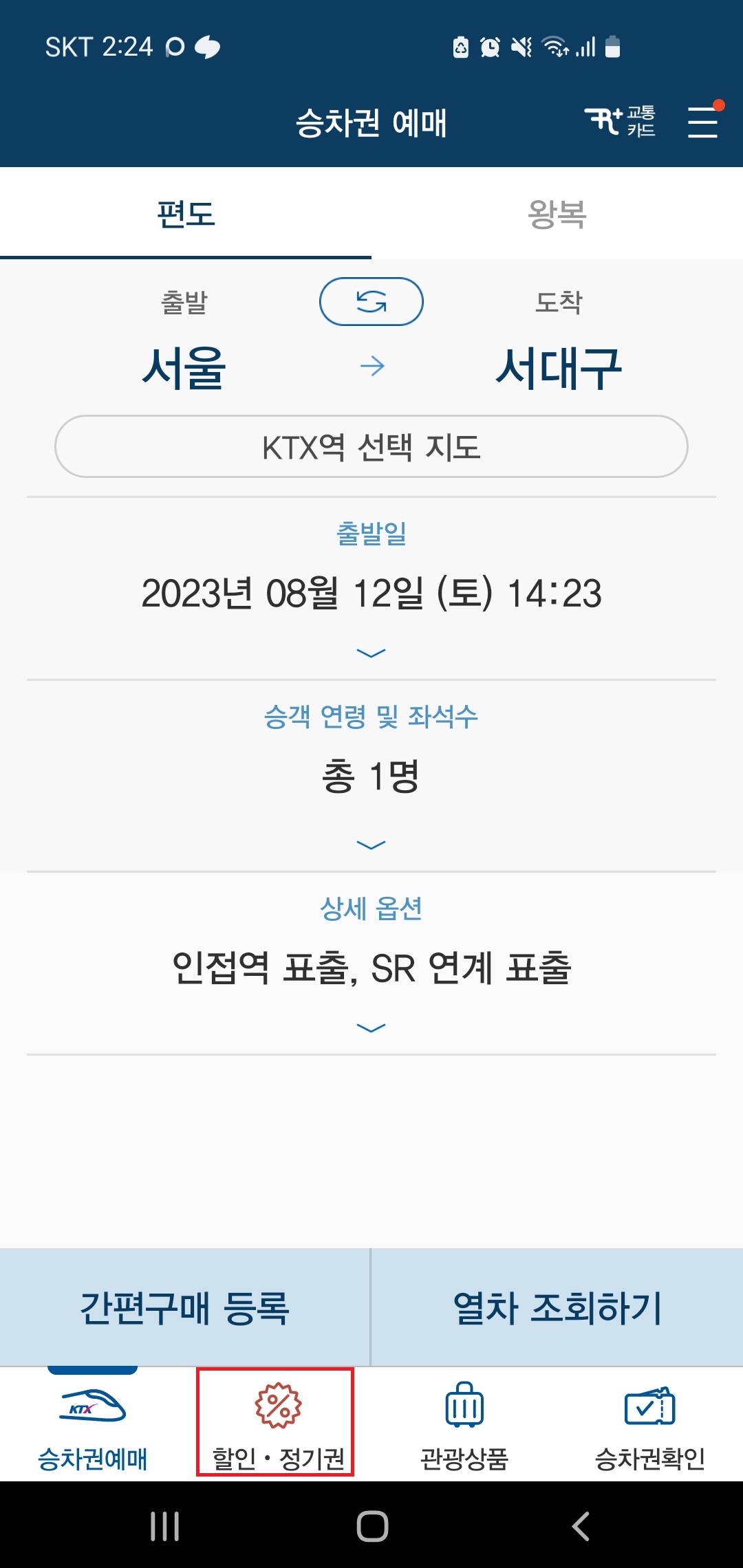 가. 코레일톡 메인화면 아래 메뉴에서 할인·정기권 터치