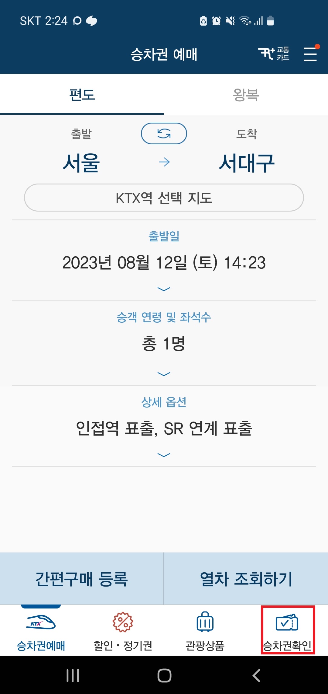 구매한 N카드를 이용해서 열차표를 구매하기 위해선 코레일톡 메인화면에서 오른쪽 아래의 승차권 확인을 눌러줍니다.