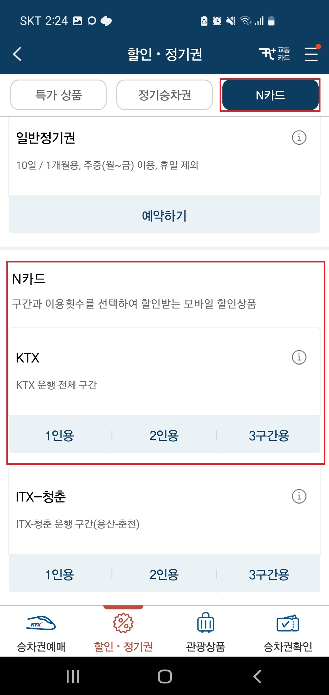 나. 오른쪽 위의 N카드 터치 후 KTX 1인용 또는 2인용 선택