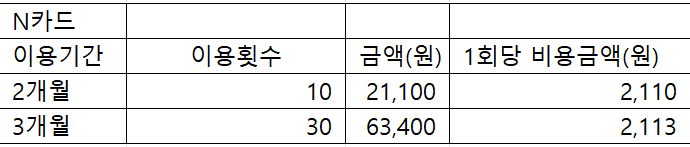 서울과 서대구 이용구간의 N카드 가격은 10회에 21,100원, 30회에 63,400원으로 1회당 비용은 2,110원으로 같습니다. 이 금액은 서울 ↔ 서대구 KTX를 할인받지 않은 금앤인 42,300원(일반실 기준)의 5%에 해당하는 금액입니다.