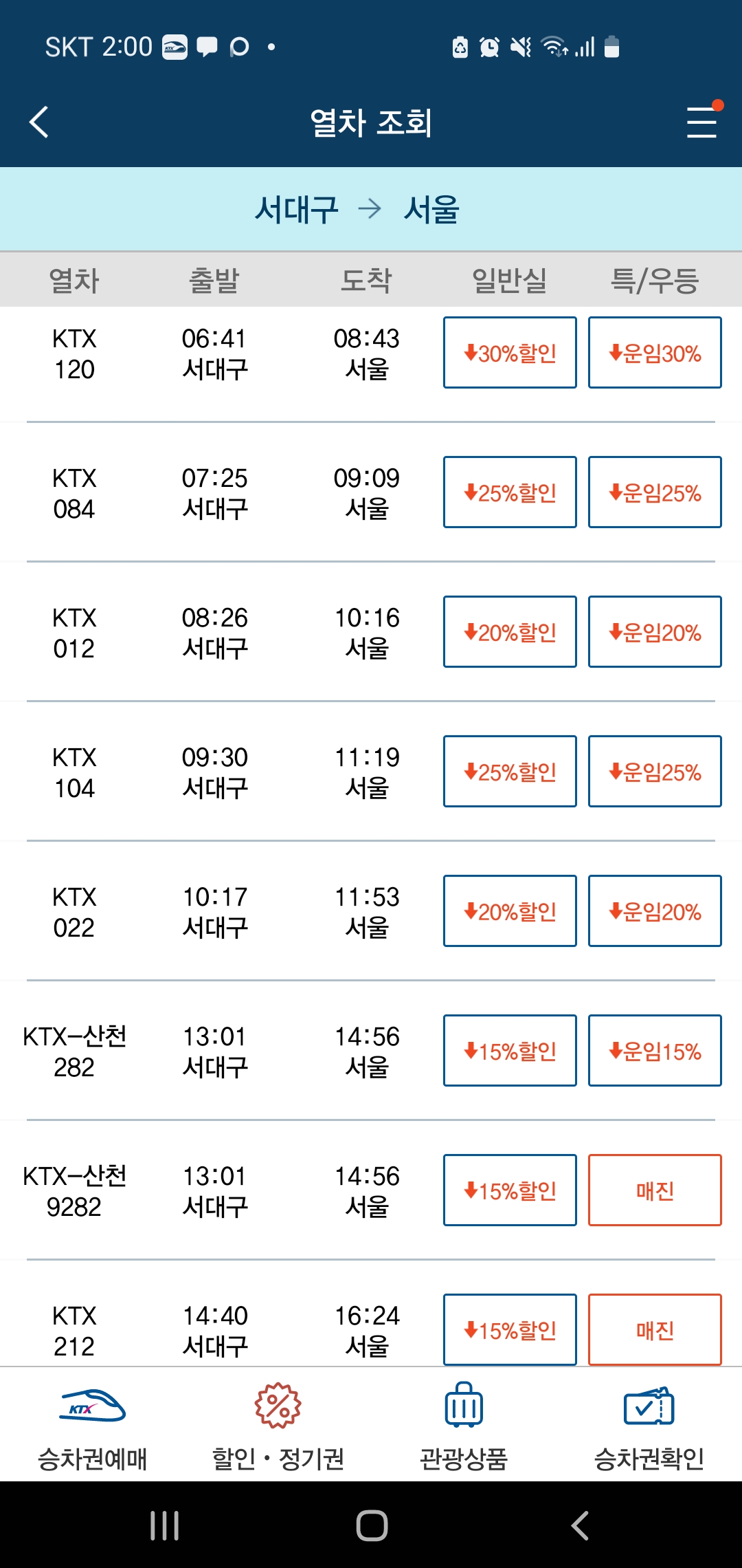 N카드를 이용한 열차 조회화면입니다. 최소 15%에서 최대 30%까지 할인되는 것을 확인할 수 있습니다. 따라서 N카드를 사용한다면 N카드 구매비용을 고려하더라도 최소 1회 사용할때마다 10%(할인율 15% - N카드 1회당 구매비용 5%)는 더 저렴합니다.